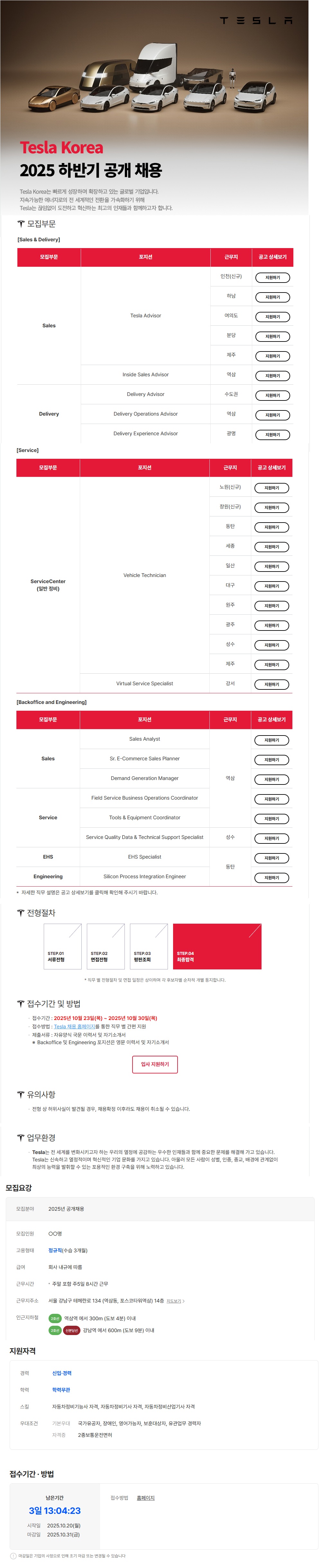 공지사항 홈 열린광장 공지사항 공유하기 블로그 페이스북 트위터 닫기 인쇄 항공자동차기계학부-학부공지(항공자동차기계학부_공지) 상세보기 - 제목, 내용, 파일, 작성자 정보 제공 [Tesla] Tesla Korea 하반기 공개 채용 작성자 : 김진희 https://hire-r1.mokahr.com/social-recruitment/tesla/100000166#/ 파일 jpg 문서 테슬라코리아.jpg 목록 게시물삭제 광고 반복작성 욕설 본인삭제 게시물삭제 이전글 한국상용트럭㈜ 가변축 외 특장차 정비원 모집 다음글 BMW그룹 코리아 하반기 정비/영업 채용